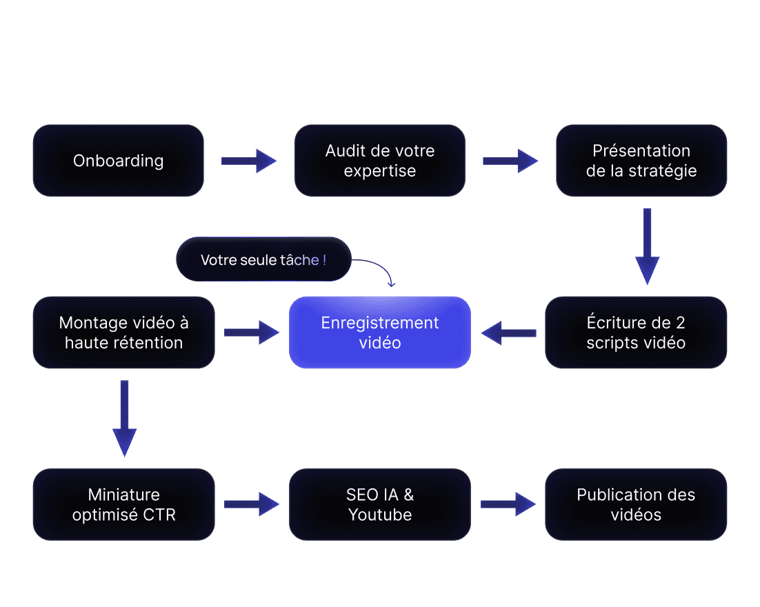 Vous filmez 2 vidéos avec nos conseils à votre rythme. Puis nous gérons le branding de votre chaîne, le montage à haute rétention et l'optimisation SEO pour être visible sur YouTube et les IA.